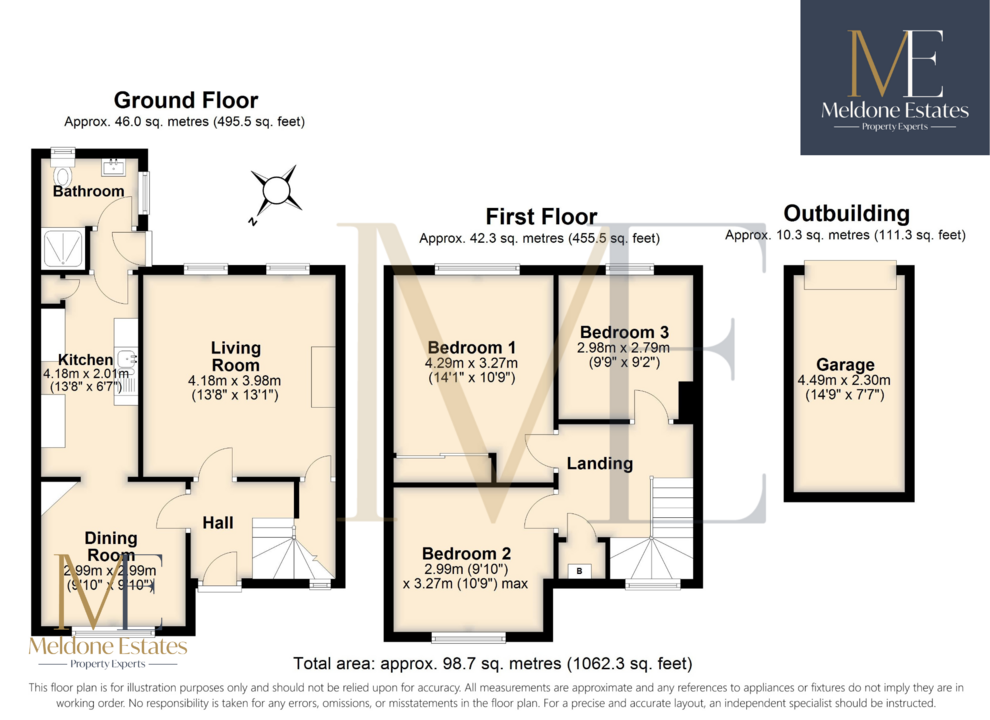 Upstairs, the first floor offers a landing with a storage cupboard, two generously sized bedrooms, and a single bedroom.